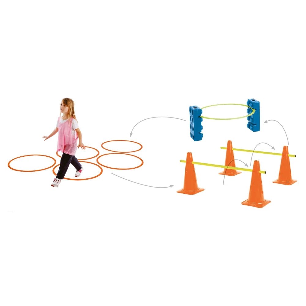 Kit comprenant : 4 cônes AC600, 2 jalons 1 m GY100, 6 cerceaux plats diamètre 50 cm CP50, 2 briques PR7.