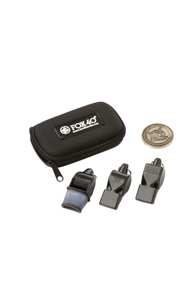 Comprend un sifflet FOX 40 CLASSIC, un sifflet FOX SONIK avec embout, et un sifflet PEARL, ainsi qu’un cordon pour sifflet et un pion pile ou face. Livré avec un étui.
